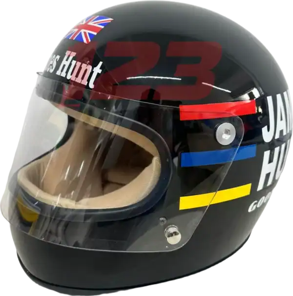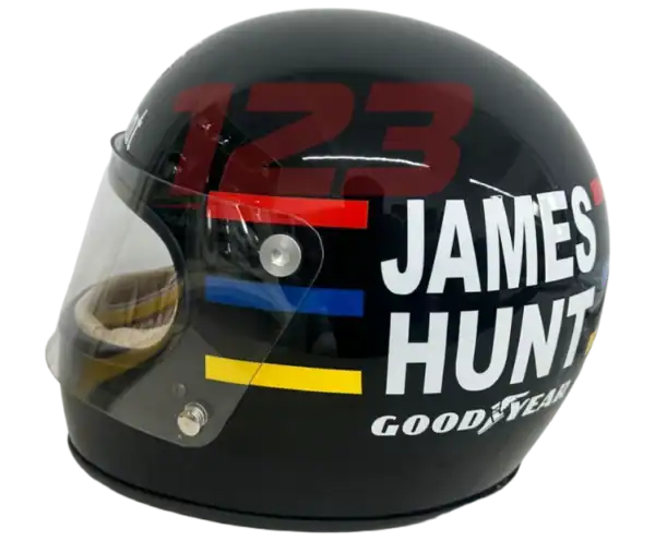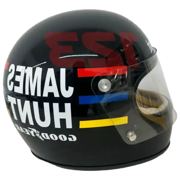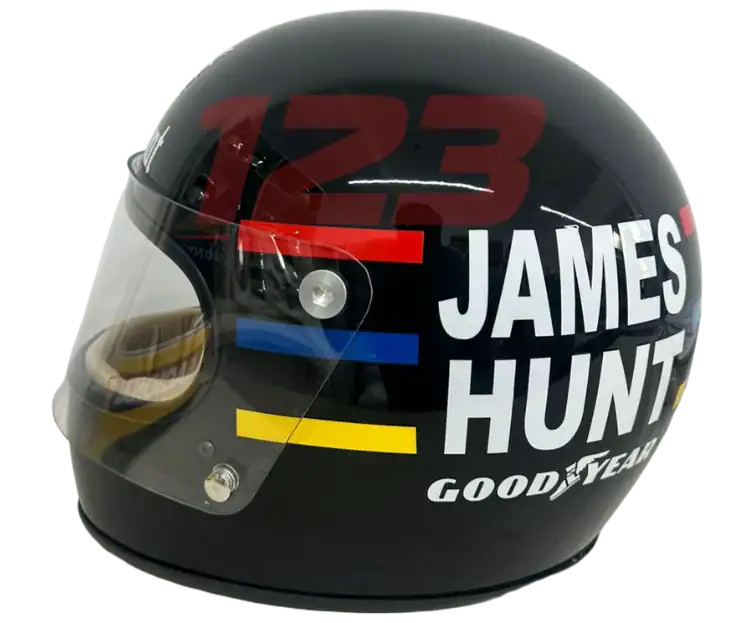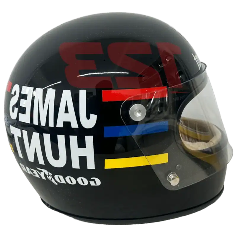 Réplique taille réelle du casque F1 1976 de James Hunt. Coque noire, bandes colorées et lettrage mythique pour une pièce de collection incontournable pour les fans de F1 vintage.