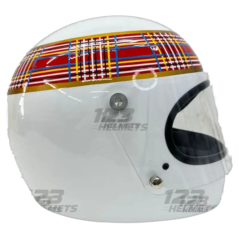 The design captures Jackie Stewart’s signature tartan pattern that became synonymous with Scottish racing excellence in the 1970s. The blue and green checkered graphics create a distinctive visual contrast against the helmet base. This iconic styling represents the golden age of Formula 1 when driver personalities were expressed through bold helmet designs. A must-have piece for collectors of classic F1 memorabilia.
